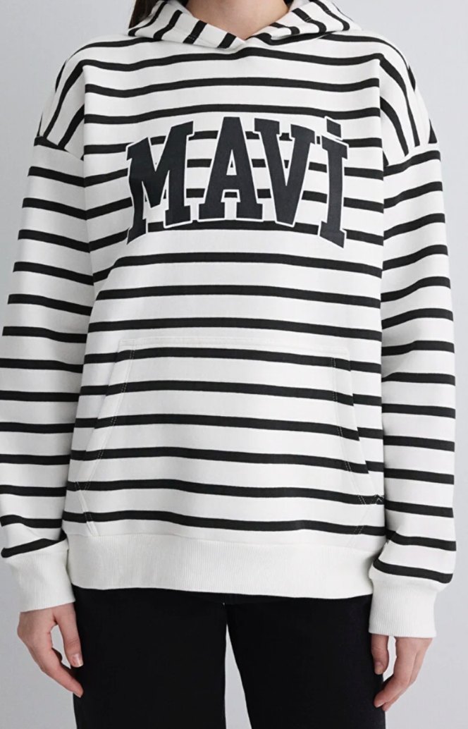 Beyaz ve gri çizgili, yuvarlak yakalı ve uzun kollu bu sweatshirt pamuklu örme kumaştan, rahat bol kesimlidir. Önünde 'MAVI' yazısı vardır. Günlük kullanım için uygundur.