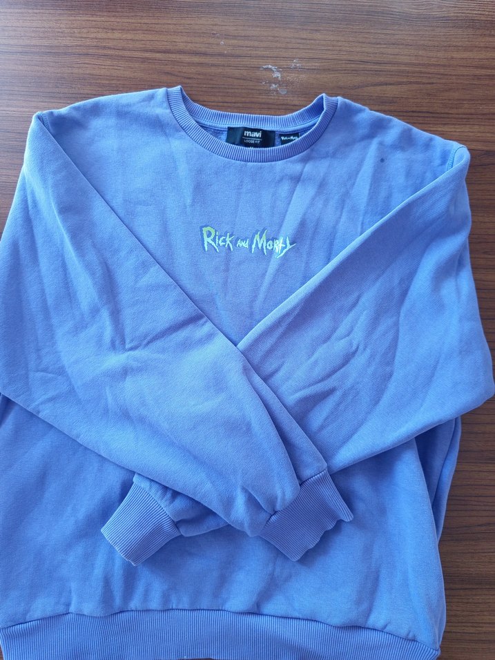 Mavi renkte, bisiklet yakalı ve uzun kollu kadın sweatshirtü. Baskılı ve örme kumaştan, rahat ve bol kesimdir. Günlük sokak stili için uygundur.