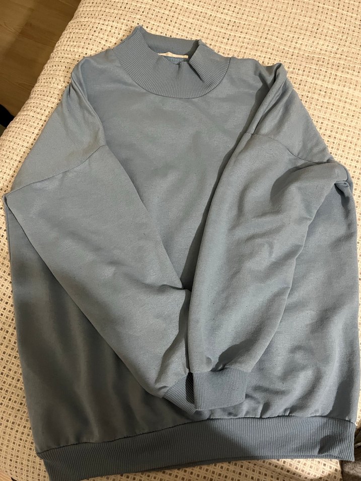 Mavi renkte, bisiklet yaka ve uzun kollu, rahat kesim kadın sweatshirt. Yumuşak keten kumaştan üretilmiş, günlük kullanım için sade ve konforlu bir parça.
