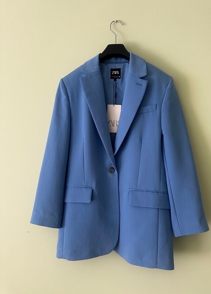 Pastel mavi keten kumaştan, düğmeli, uzun kollu, regular fit kesime sahip blazer ceket. Ofis ve günlük kullanıma uygun.