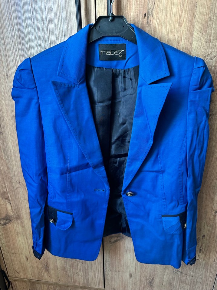 İpek gibi mavi kadın blazer, kesik yaka, düğmeli ön ve uzun kollu. Normal kesim ve parlak doku, ofis veya günlük kullanım için uygun. ✨