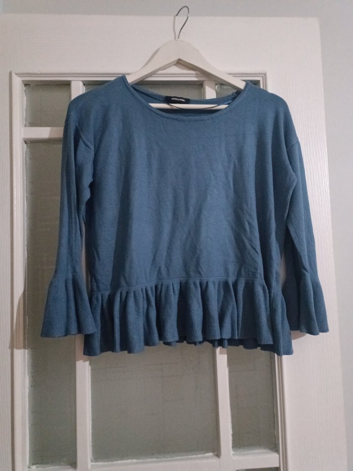 Mavi yetim kol fırfırlı ve yuvarlak yakalı kadın bluzudur. Bol kesimiyle rahat ve gündelik bir görünüm sunar. en 55 boy 55