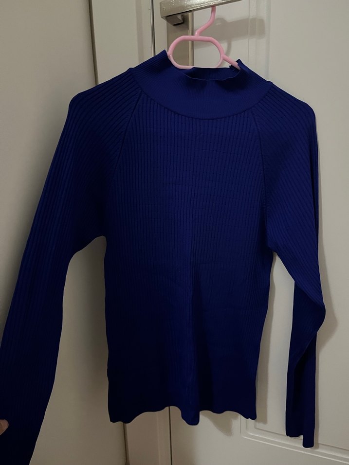 Koyu mavi renkte, boğazlı ve uzun kollu, ince triko kumaştan yapılmış, normal midi boyda, rahat ve sade kesim kadın kazak.