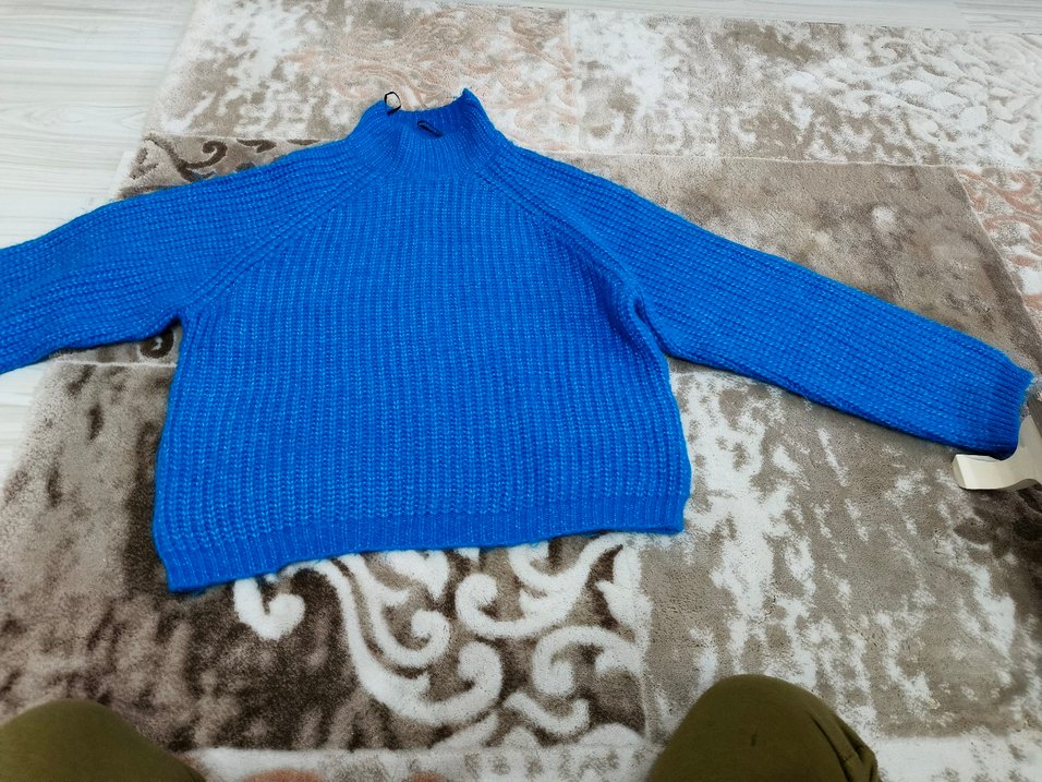 Mavi renkli, boğazlı ve uzun kollu, örgü kadın kazak. Salaş ve kısa kesimiyle rahat, şık bir günlük kombin için ideal.