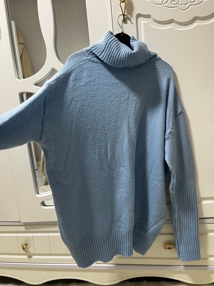 Mavi renkte, boğazlı ve uzun kollu, örme kumaştan yapılmış bol kesim bir triko kazak. Uzun boy sade tasarımı günlük kullanıma ve tesettüre uygundur.