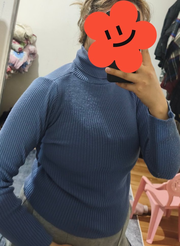 Mavi renkli, boğazlı ve uzun kollu kadın triko kazak. İnce ve vücuda oturan kesimiyle günlük kullanıma uygundur.