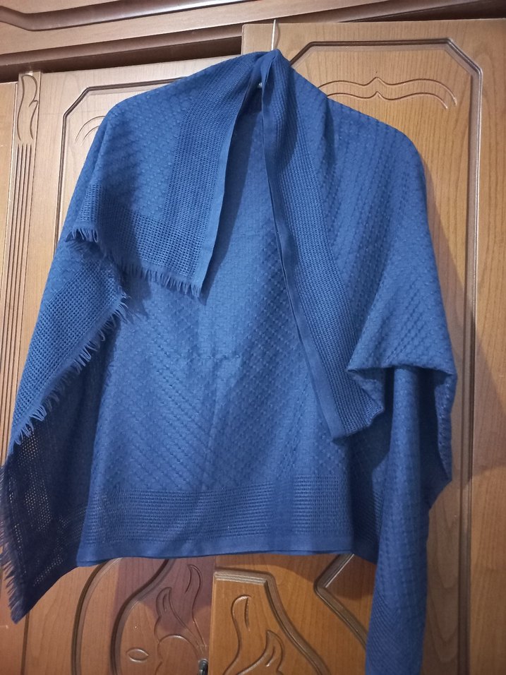 Mavi renkte, görünümlü, dökümlü tasarıma sahip kadın şalı, yumuşak sentetik kumaştan yapılmış, rahat ve sade bohem tarzda. kullanıldı fakat hiçbir problemi yok