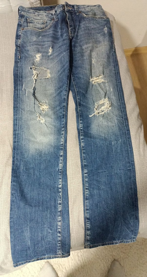 Parlak görünümlü, yıpranmış detaylı mavi bol kesim denim midi pantolon. Günlük sokak stili için tokalı tasarıma sahiptir.