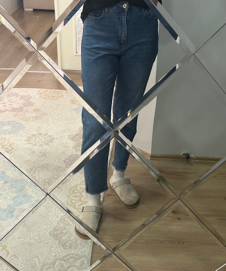 Mavi, bol kesim, normal boyda denim pantolon, tokalı detaylı. Günlük rahat kullanıma uygun. ️