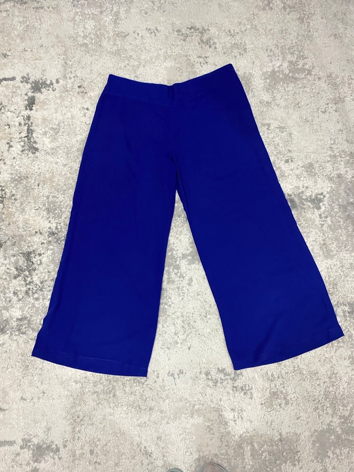 Bol kesim mavi kumaş pantolon, parlak görünümlü. Sokak stili ve athleisure için uygun. Çok az kullanıldı. Özel dikim bir pantolon ölçüleri bel 47 cm boy 96 cm. Herhangi bir deformesi yoktur. Bol paça normal yüksek bel arası göbek kısmını kapatıyor.