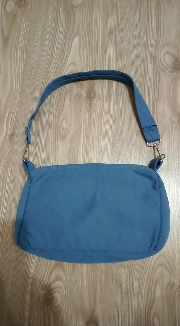 Pastel mavi sentetik kumaştan, fermuarlı, sade ve desensiz tasarıma sahip günlük kullanıma uygun kadın çantası.