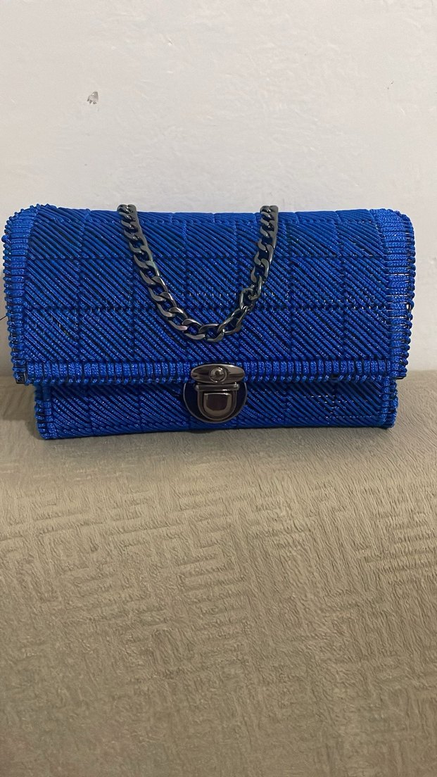 Mavi renkte, tokalı ve zincir askılı kadın çantası. Sentetik kumaştan üretilmiş, minimalist ve renkli tasarıma sahip, günlük kullanım için uygundur.