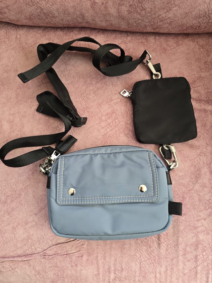 Mavi renkli, tokalı kapaklı çapraz çanta ve küçük çıkarılabilir siyah cüzdan. Sentetik kumaştan, minimalist sokak stili için uygun, günlük kullanıma ideal.