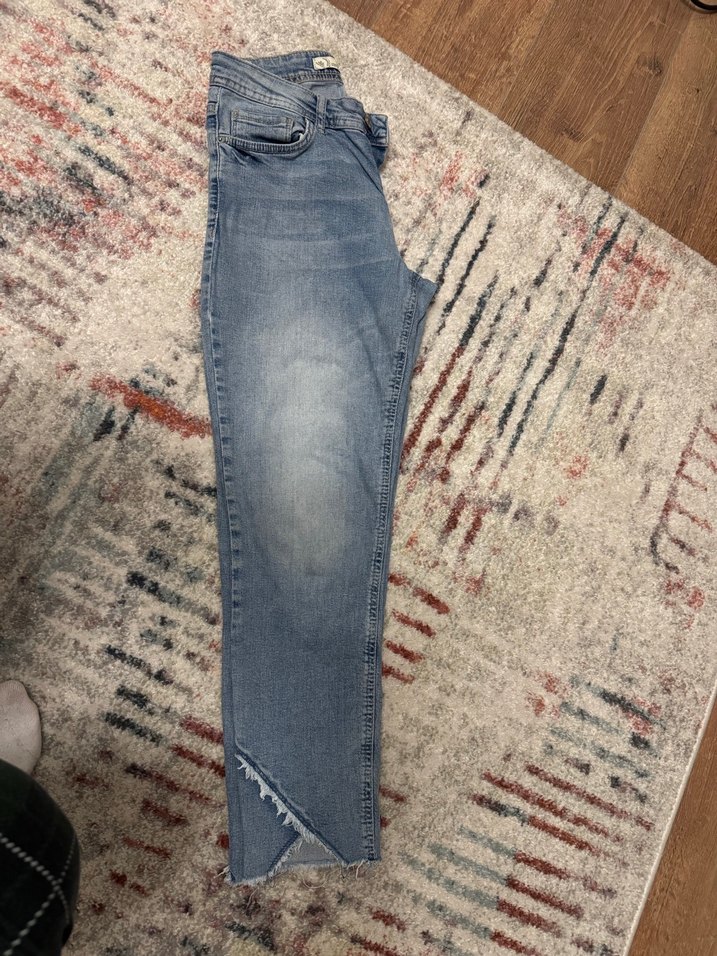 Mavi denimden yapılmış, dar kesim ve midi boy kadın pantolonu. Hafif batik deseni ve kürk detaylarıyla günlük sokak stili için uygun.