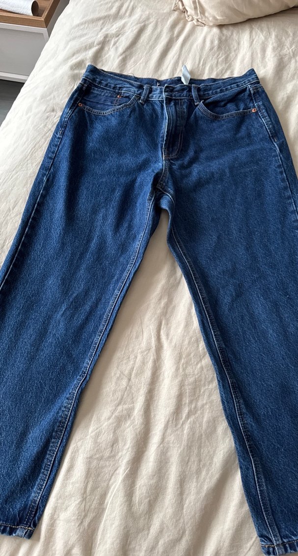 Mavi denimden yapılmış, bol kesim ve normal boyda kadın jean. Parlak yüzeyi ve sade deseniyle günlük kullanıma uygun, minimal ve zahmetsiz şıklık sunar.