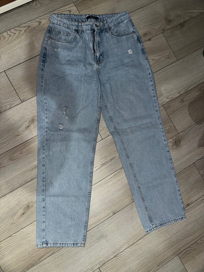 Mavi renkli, bol kesim ve yüksek bel kadın denim jean. Sade ve yıpratma detaylı, rahat ve şık bir günlük stil için uygun.