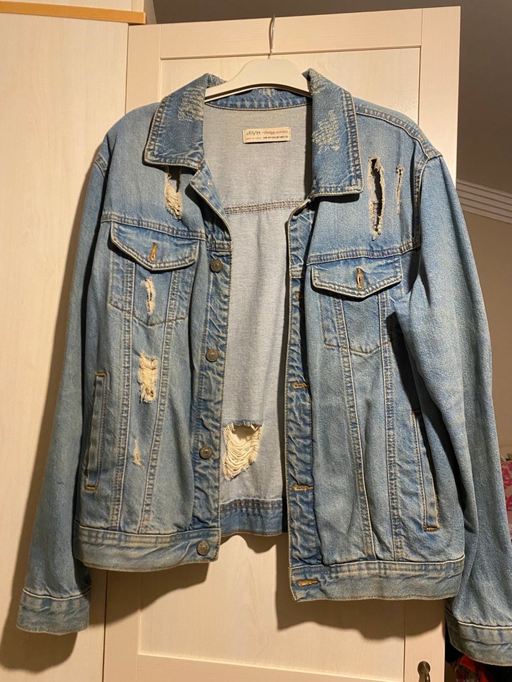 Düğmeli, uzun kollu, yırtık desenli oversize bol kesim mavi denim ceket. deformesi yoktur ürün az kullanıldı.