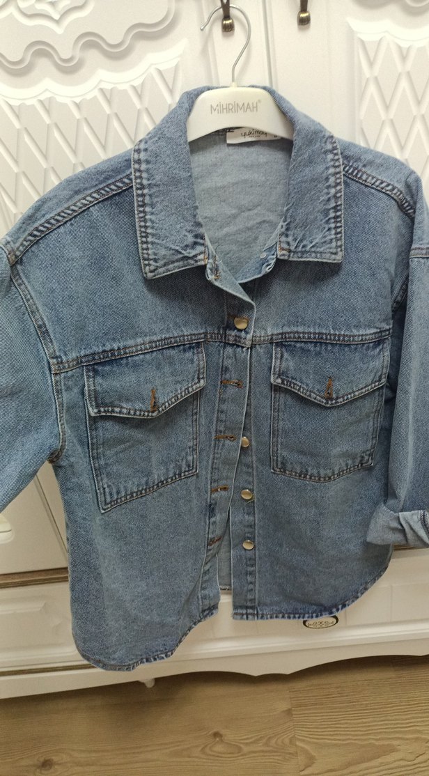 Uzun kollu, düğmeli, mavi denim ceket. Rahat kesim ve çıt çıt yakalı, günlük rahat stil için uygun.