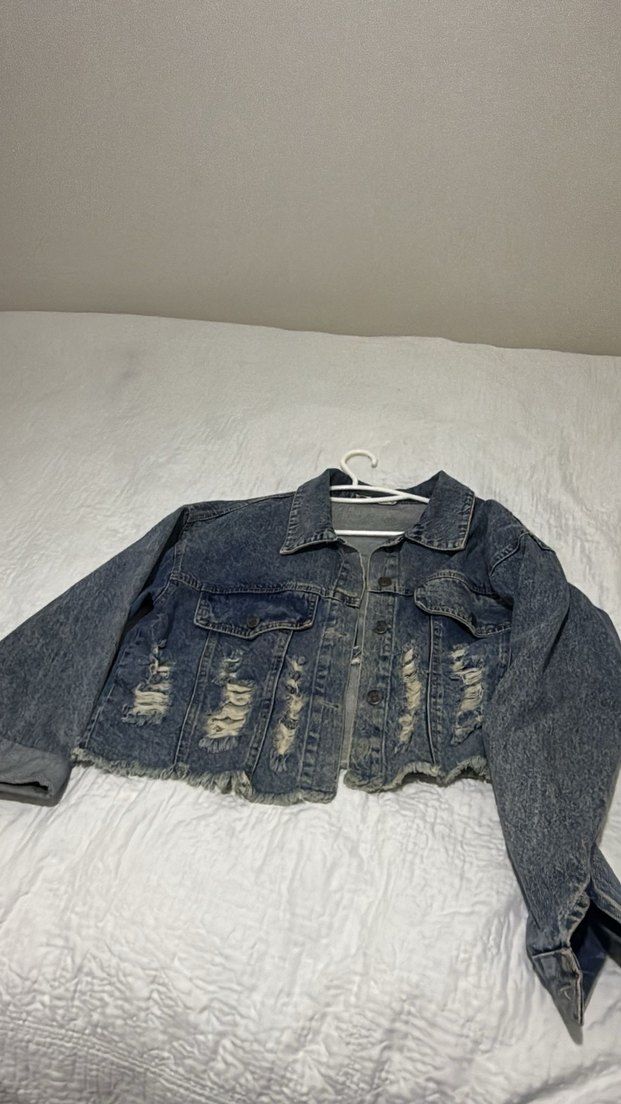 Mavi renkli, düğmeli, salaş kesim kadın denim ceket. Uzun kollu ve yakalı, desen içermeyen yıpranmış görünüme sahip, günlük sokak tarzı için uygun.