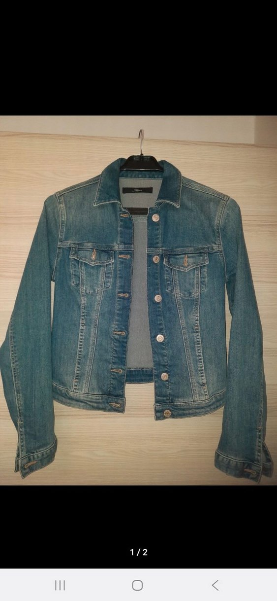 Düğmeli, uzun kollu, mavi kadın denim ceket. günlük rahat kullanıma uygun.