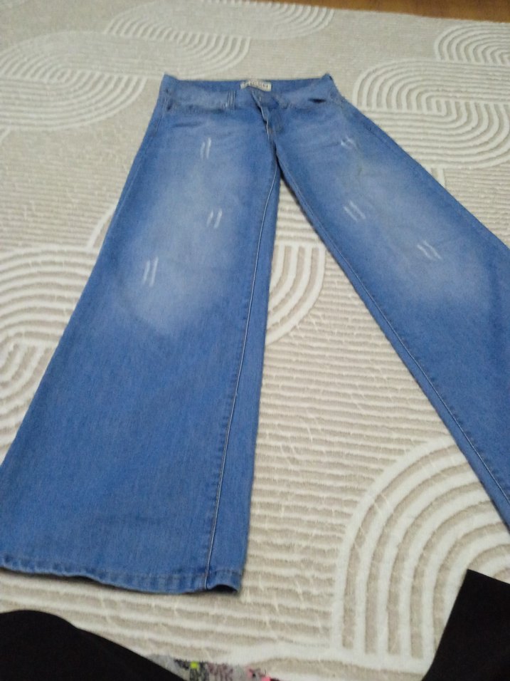 Mavi denim kumaştan, normal boy ve geniş paça kesime sahip, günlük kullanıma uygun rahat ve şık kadın jean.