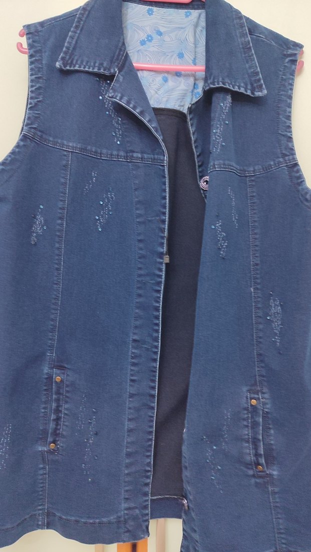 Mavi kolsuz denim ceket, notched yaka ve düğmeli ön detaylı. Rahat kesimli, hafif yıpranmış görünümlü, günlük sokak stili için uygun hiç kullanılmadı iki kol arası düğme kapalıyken 57 santim boy omuzdan 78santim kot yelek ürünün rengi 3 fotoğraftaki gibidir diğerleri ışıktan dolayı farklı çıkmıştır