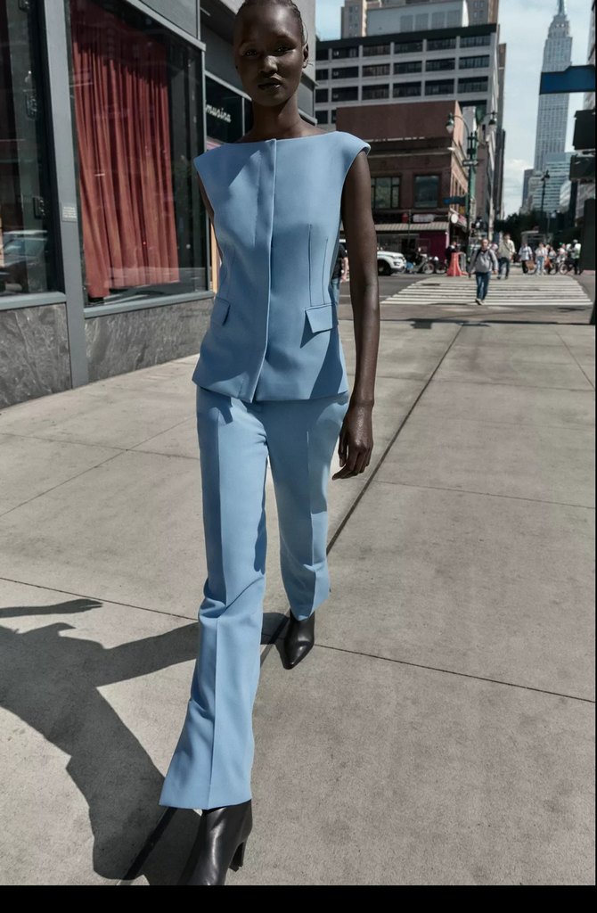 Pastel mavi renkte, kolsuz ve notched lapel yaka detaylı kadın denim takımı. Midi boy ve rahat kesimle ofis için uygun, zahmetsiz şıklık sunar.