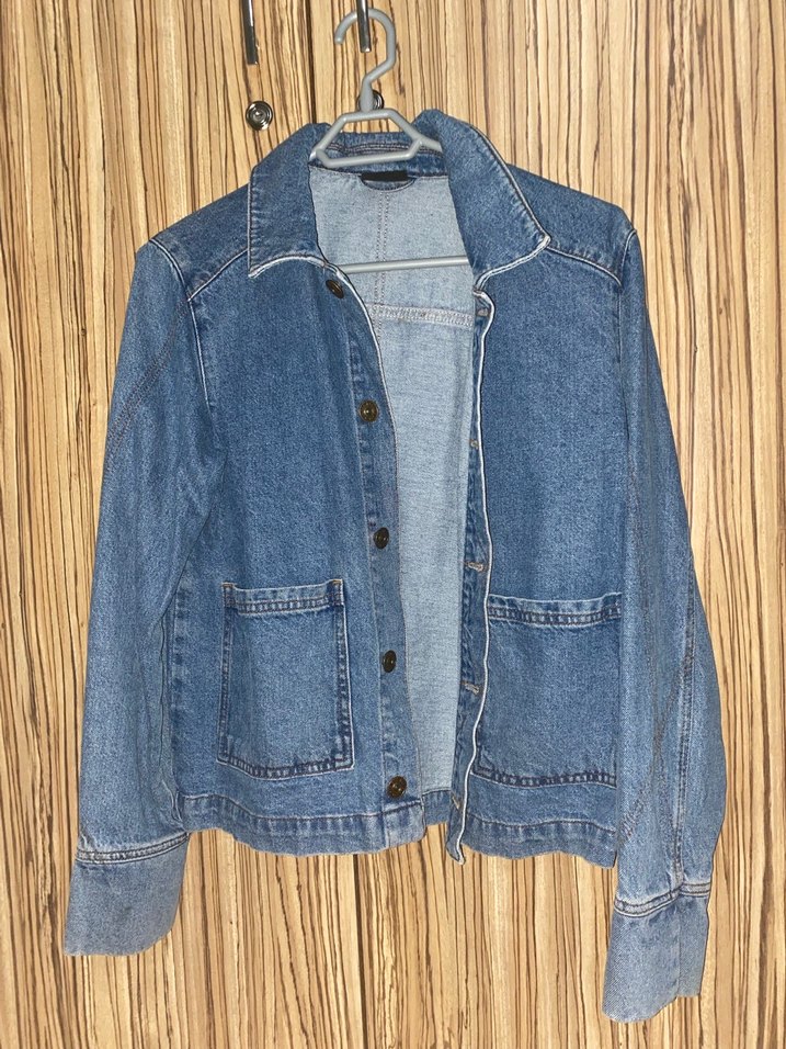 Düğmeli, uzun kollu ve kesik yakalı mavi denim ceket. Günlük rahat kullanıma uygun, normal kesim.