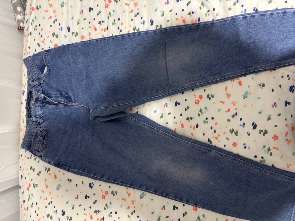Mavi denim kumaştan, bol kesim ve midi boy kadın jean.