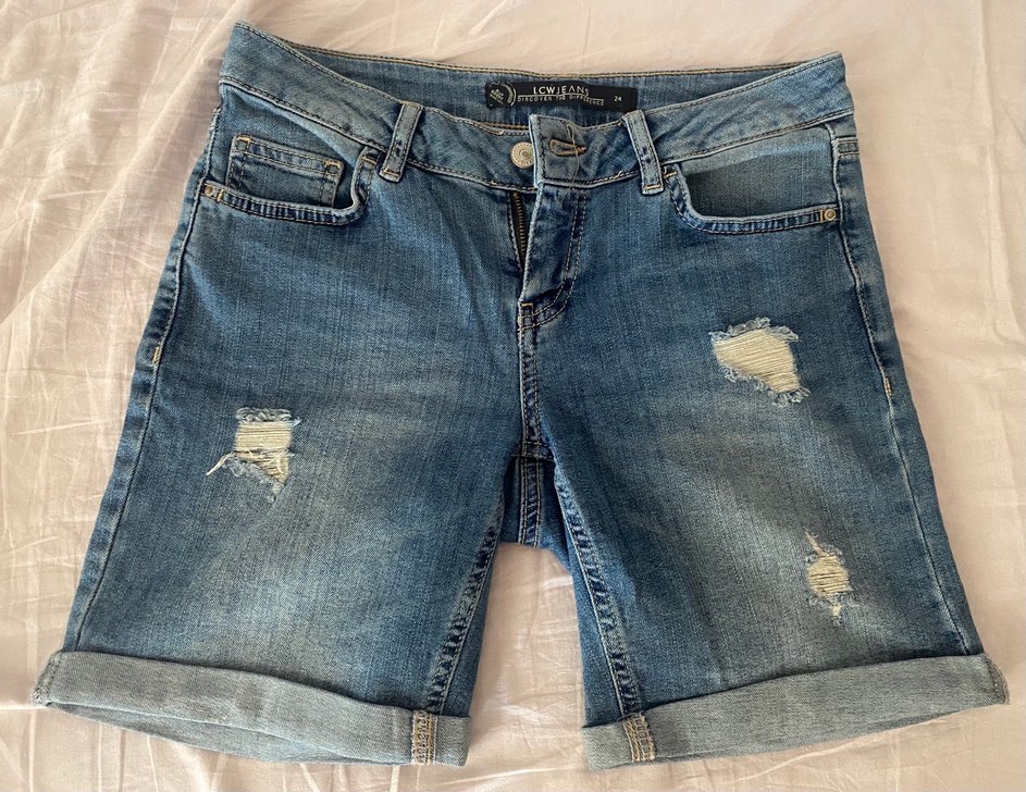 Mavi renkli, bol kesim ve kemerli detaylı denim midi şort. Hafif yıpranmış görünümü ve parlak dokusuyla günlük dış mekan kullanımı için uygundur.