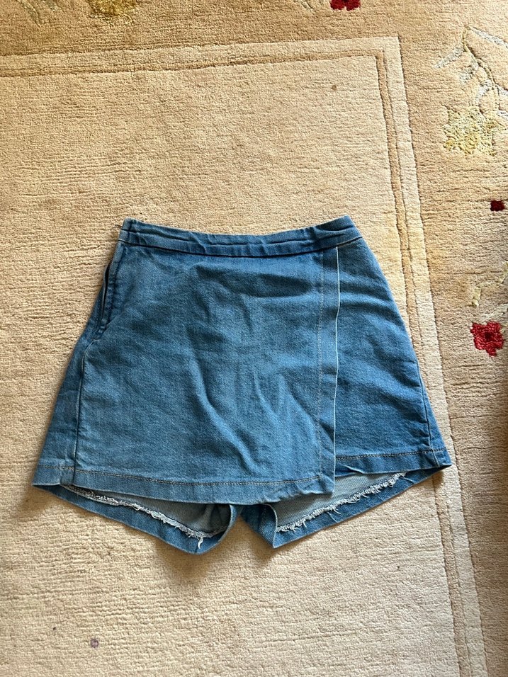 Mavi renkli, rahat kesim denim mini kot şort etek Günlük sokak stiline uygun, zahmetsiz şıklık sunar. Trendy casual tarz için ideal.