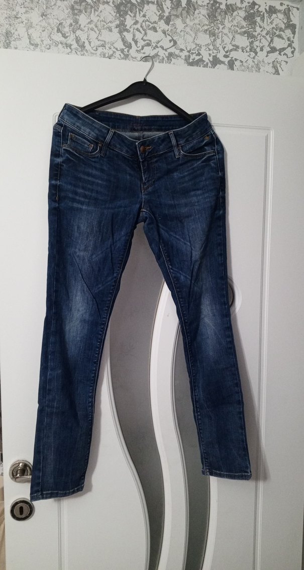 Mavi denim kumaştan, normal boy ve regular fit kesime sahip, tokalı detayıyla günlük sokak stili için uygun kadın pantolon.
