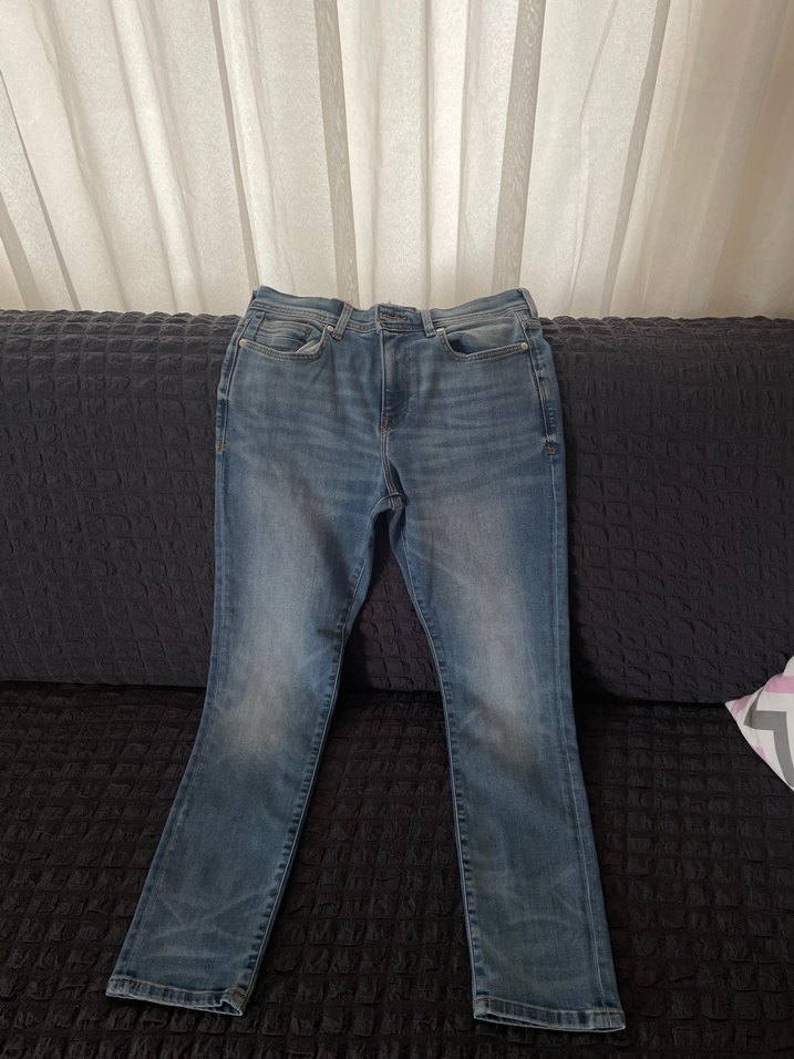 Normal midi boy,ve düz desenli mavi denim kadın pantolon. Günlük rahat kullanıma uygundur.