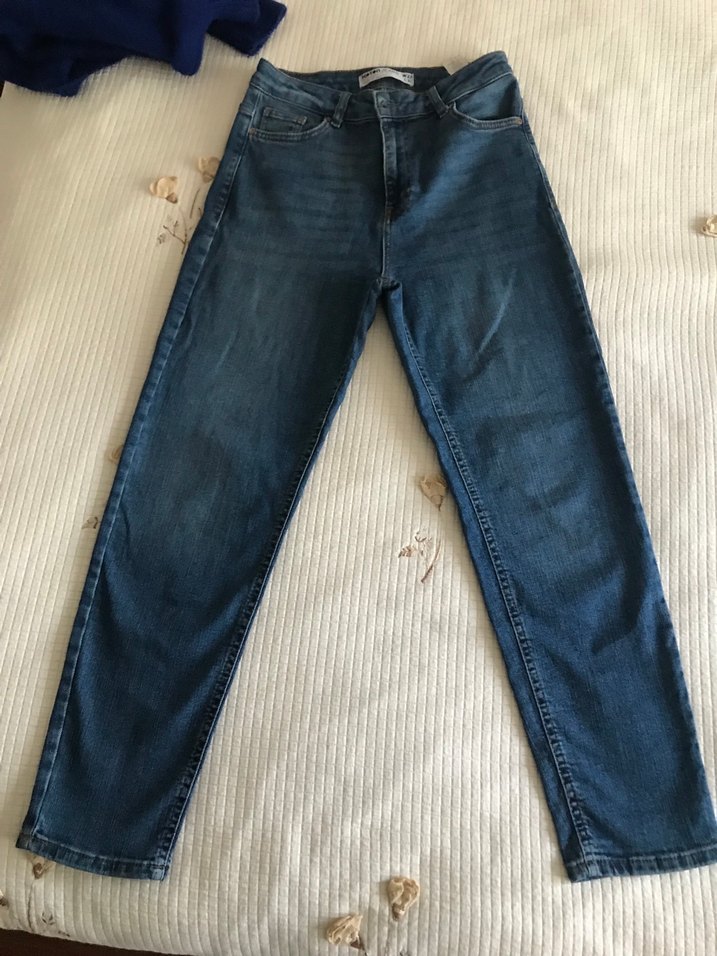 Kadınlar için mavi tonlarında, normal boy midi uzunluğunda, düz desenli denim pantolon. Rahat ve gündelik kullanıma uygun.