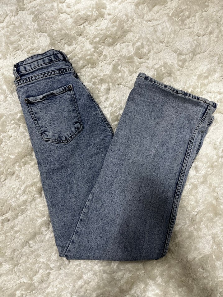 Mavi denim kumaştan yapılmış, bol kesim ve yüksek bel, rahat kadın pantolon. Günlük kullanıma uygundur.