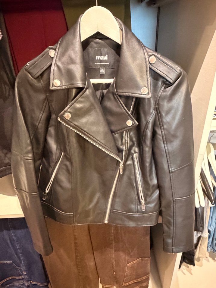 Siyah deri biker ceket, çıtçıtlı yakası, tokalı detayları ve strappy kollu, normal kesimi ile sokak stiline uygun.