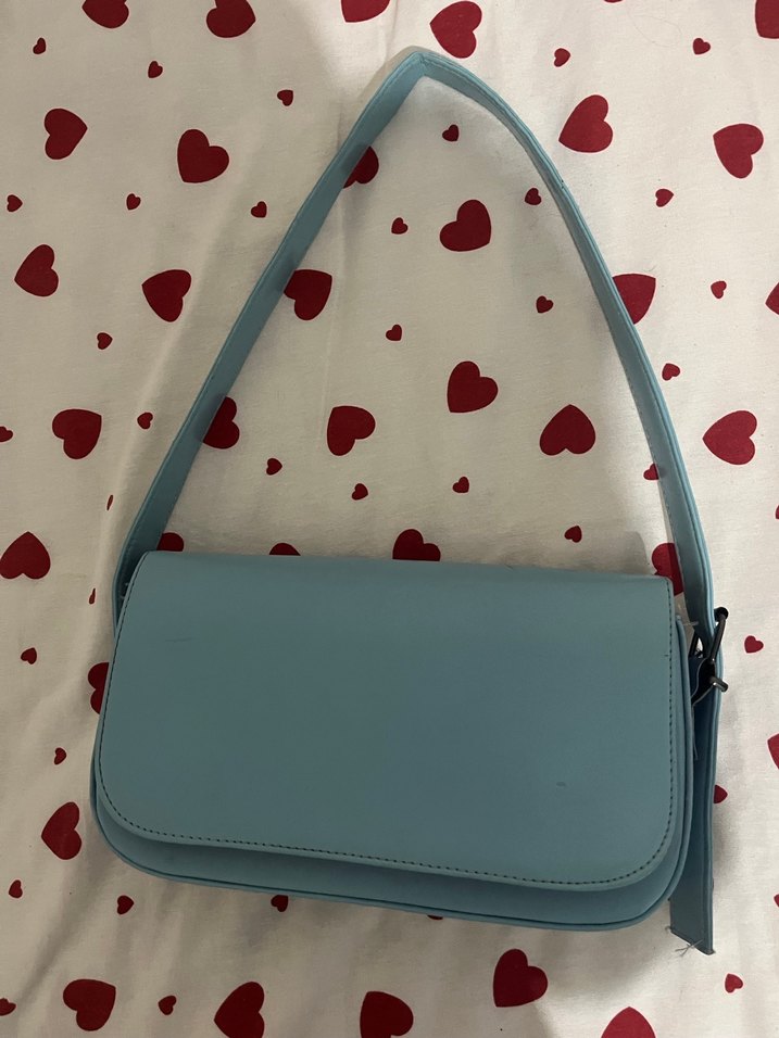 bi kere taktım ama sapı askıda durdugu için öyle Pastel mavi renkte, deri malzemeden yapılmış, tokalı ve desen içermeyen kadın omuz çantası. Trendy casual sokak tarzına uygun, günlük kullanım için ideal.