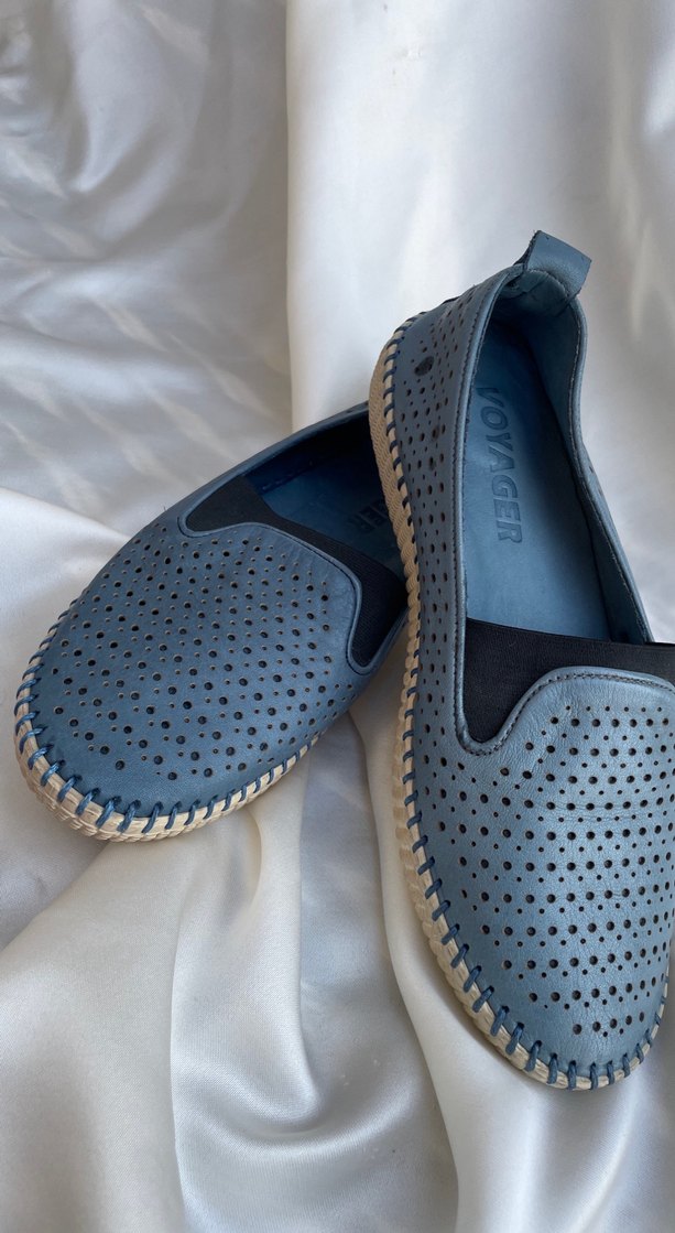 Mavi renkte, delikli tasarıma sahip kadın dolgu topuk espadril. Kauçuk malzemeden yapılmış, günlük rahatlık için uygun, minimalist stile sahip. İç tabanda OYAGER yazısı bulunur. Hiç kullanılmamıştır Marka temsilidir Orijinal deridir