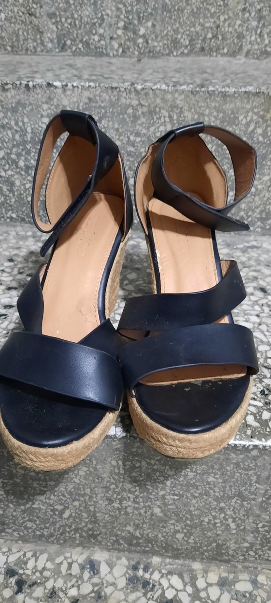 Koyu mavi renkte, tokalı bantlı ve kauçuk tabanlı dolgu topuklu sandaletler, sade ve bohem tarzı yansıtır. defolarini cektim