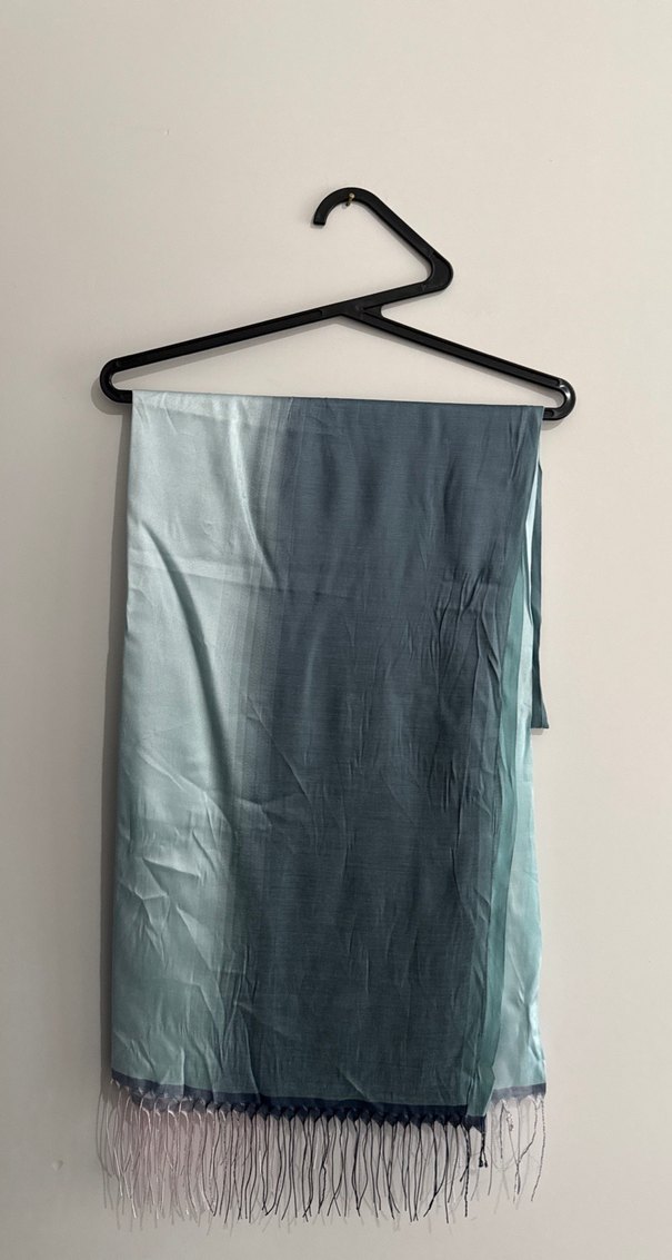 Kadınlar için mavi tonlarda degrade renkte, sentetik kumaştan drapeli bohem ve minimalist tarzda şal.