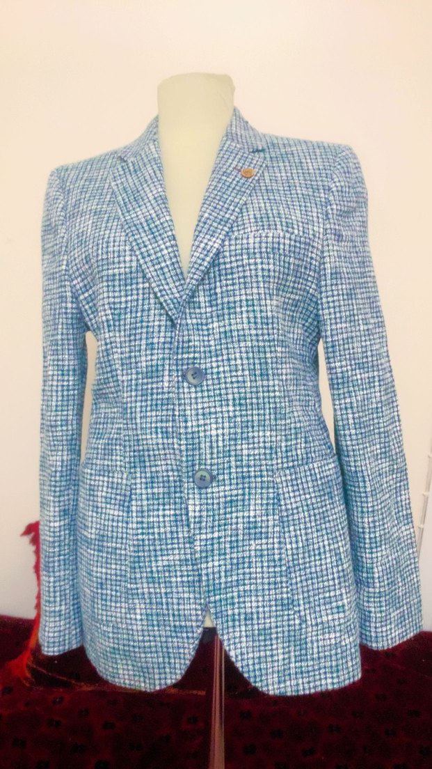 Mavi renkli, düğmeli, regular fit kadın blazer ceket. Notched lapel yakalı, uzun kollu, ofis için uygun, renkli desensiz tasarım.