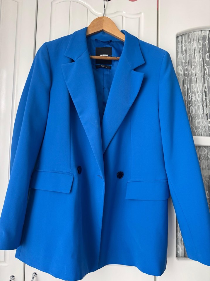 Mavi renkli, düğmeli, normal kesim kadın blazer ceket. Uzun kollu, diz hizasında ve yumuşak, sıcak dokulu kumaştan üretilmiştir.
