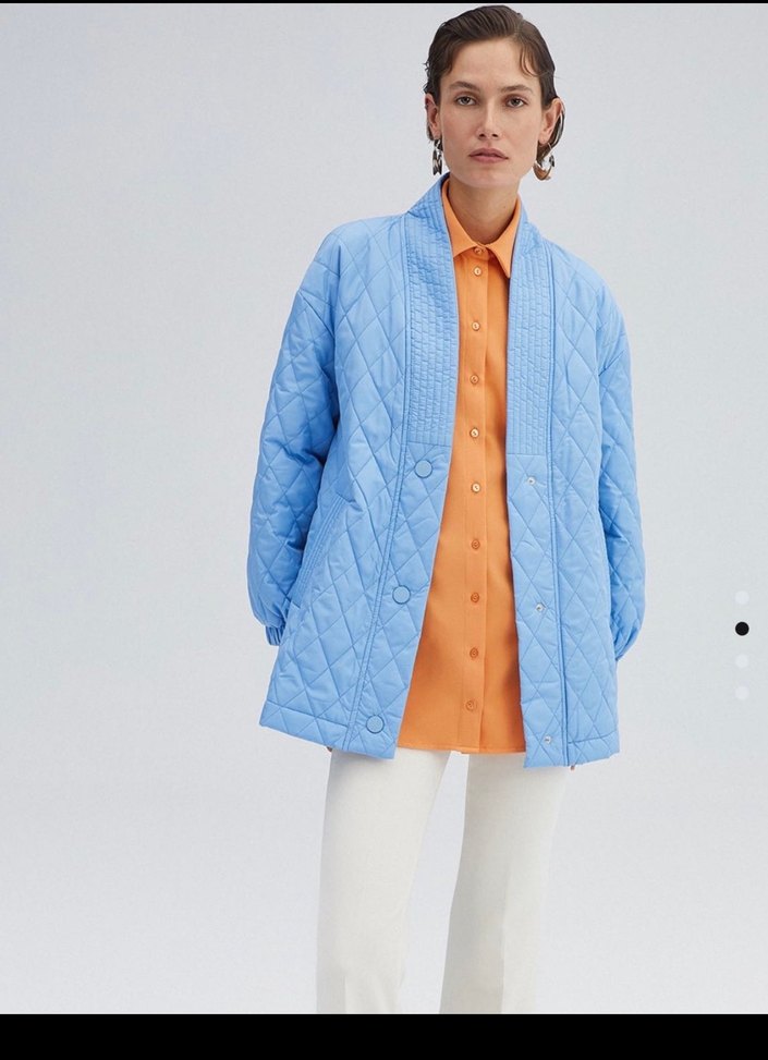 Mavi renkte, uzun kollu, düğmeli ve normal kesim pamuklu kadın ceketi. Midi boyda, gündelik kullanıma uygun rahat bir modeldir.