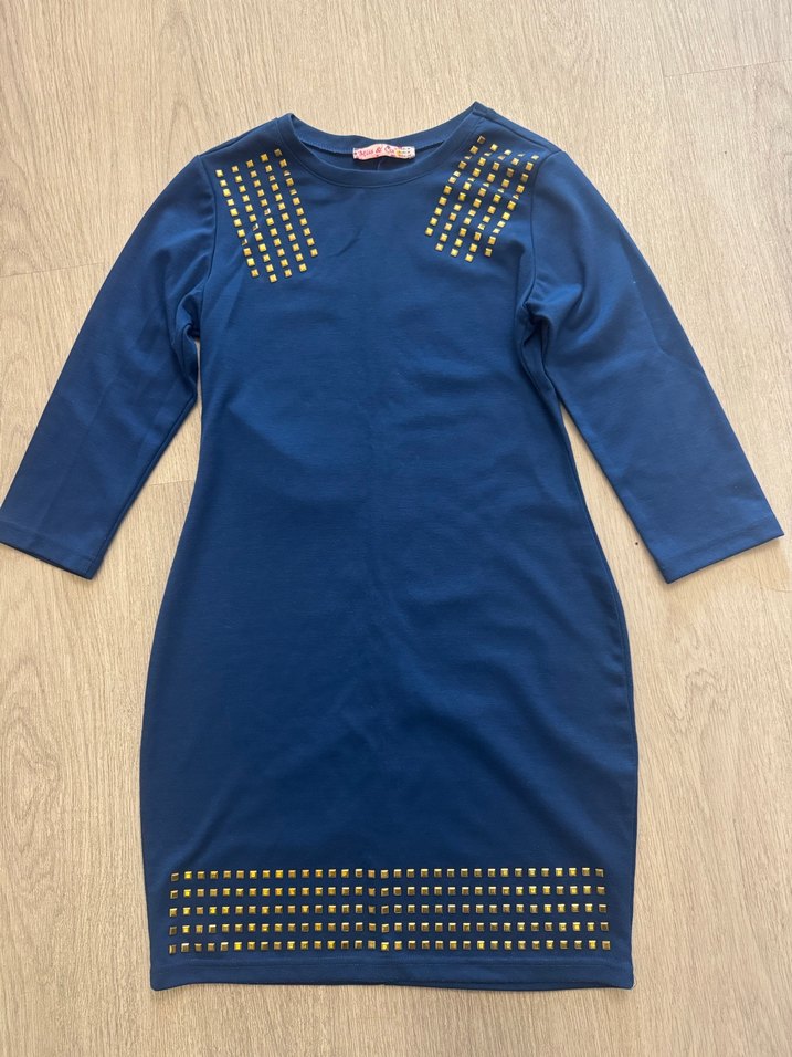 Uzun kollu, bisiklet yaka, boncuk detaylı mavi elbise. Vücudu saran kesimi ve midi boyuyla günlük kullanıma uygundur. Hiçbir sorunu yoktır