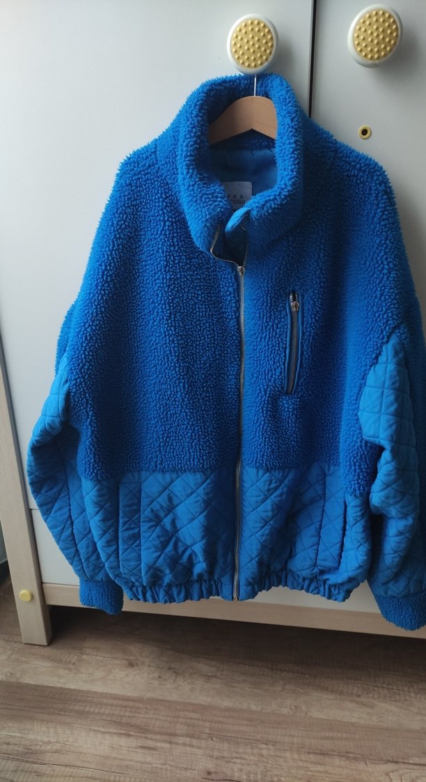 Koyu mavi renkte, yumuşak ve sıcak kumaştan yapılmış kadın fermuarlı polar ceket. Yüksek yakalı, uzun kollu ve bol kesimdir. Alt kısmı ve kolları kapitone detaylıdır. fermuarı çekme yeri kopmuştur ama kapatmaya engel değildir