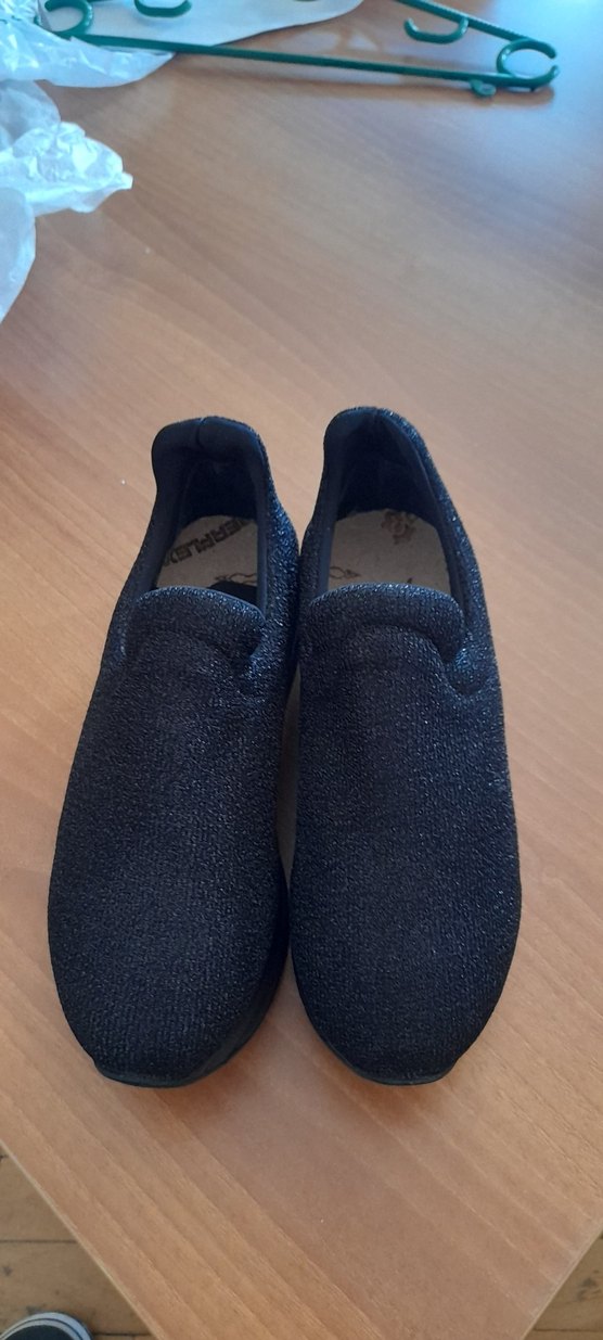 Mavi parlak yüzeyli, dolgu topuklu ve cırt cirtlı dayanıklı kauçuk kadın günlük ayakkabılar.