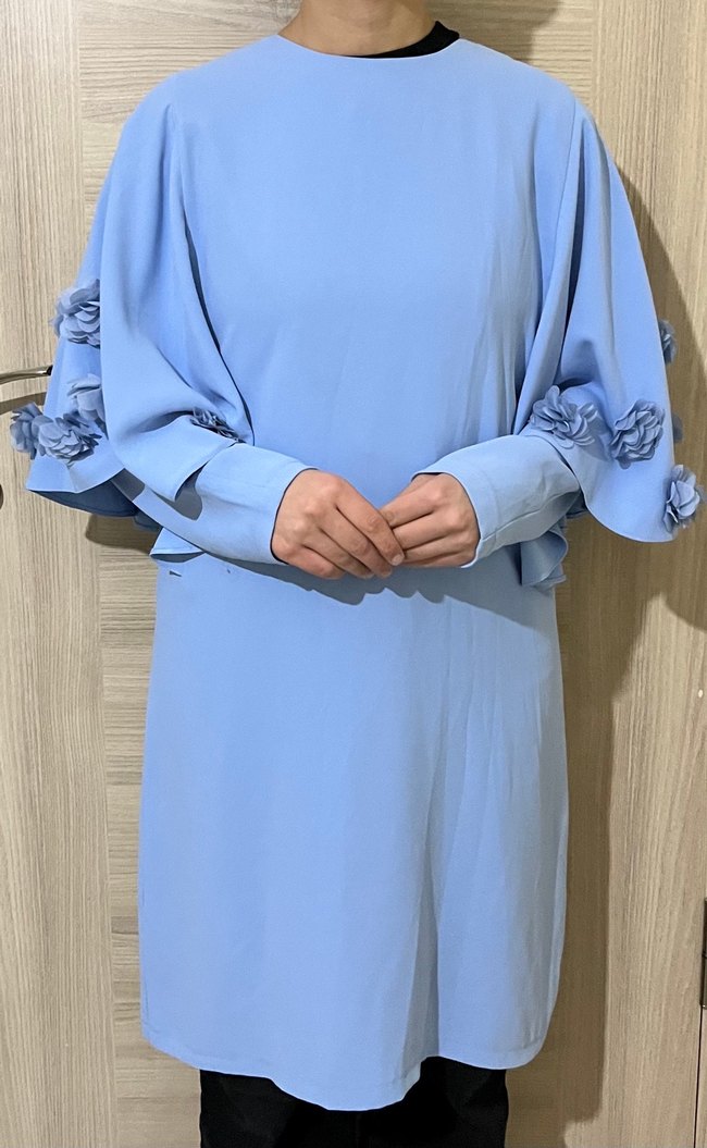 Mavi , yüksek yakalı ve uzun kollu, bol kesim tunik. Kollarında çiçek detaylı drapeli tasarım, yumuşak sentetik kumaştan, sade ve muhafazakar tarz için uygun.