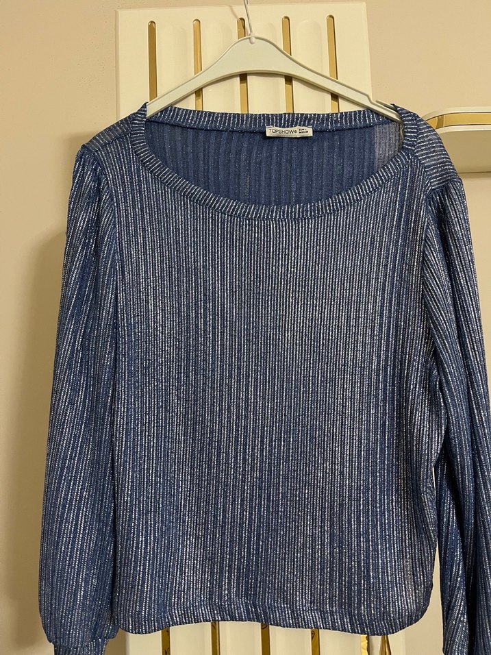 Mavi , pilili dokulu, yuvarlak yaka ve uzun kollu bol kesim kazak. Günlük rahat kullanım için uygundur. Yine çok ince bir formda gerçekten çok rahat Işıl ışıl görünse de onun hiçbir rahatsızlığı yok ışıltısı kendiliğinden yakası biraz geniş L beden
