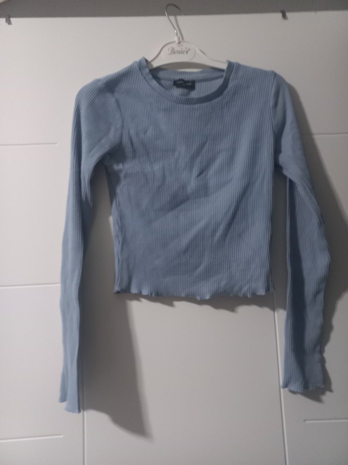 Uzun kollu, yuvarlak yakalı ve vücuda oturan kesime sahip mavi kadın triko. Yumuşak keten kumaştan üretilmiş, günlük kullanım için rahat ve şık bir parça.