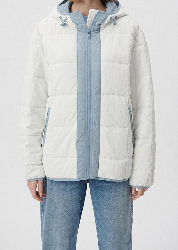Beyaz renk kenarları ve içi mavi kapüşonlu fermuarlı mevsimlik mont geçen sene alındı az kullanıldı deformesi yoktur yeni gibi